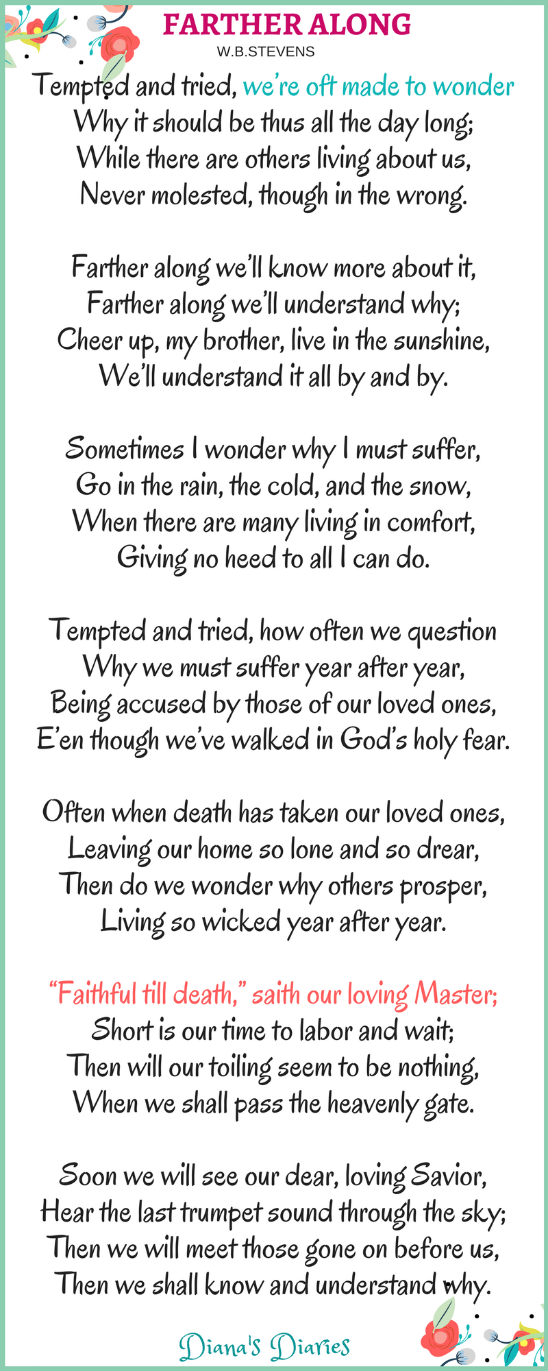 Songs have comforted me all my life. I dedicate this particular song by W.B. Stevens “Farther Along” to you.